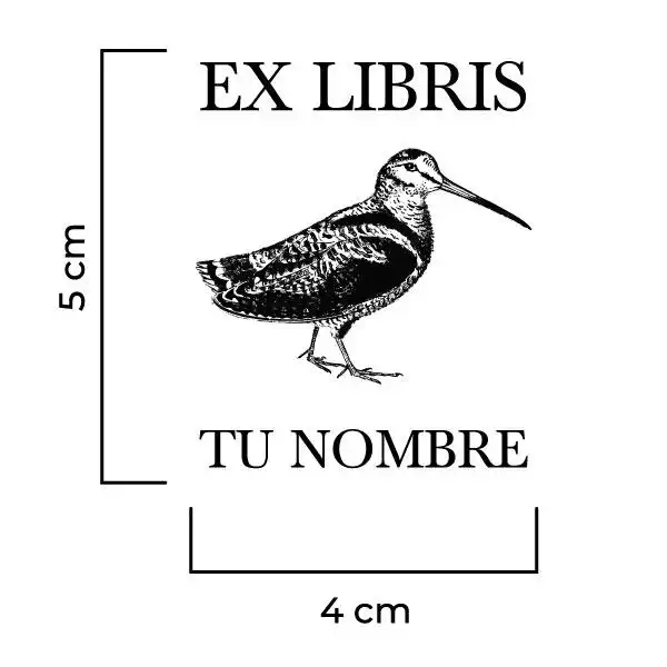Sello Exlibris Ave. Sello de caucho exlibris con goma fabricada en resina para impresiones nítidas y de larga duración, montado en montura de hierro zincado, ventana de impresión de metacrilato y mango de madera lacado negro.