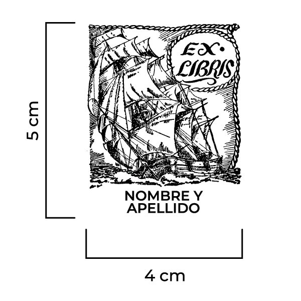 Sello Exlibris Barco. Sello de caucho exlibris con goma fabricada en resina para impresiones nítidas y de larga duración, montado en montura de hierro zincado, ventana de impresión de metacrilato y mango de madera lacado negro.
