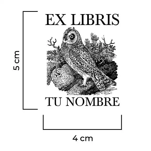 Sello Exlibris Búho. Sello de caucho exlibris con goma fabricada en resina para impresiones nítidas y de larga duración, montado en montura de hierro zincado, ventana de impresión de metacrilato y mango de madera lacado negro.