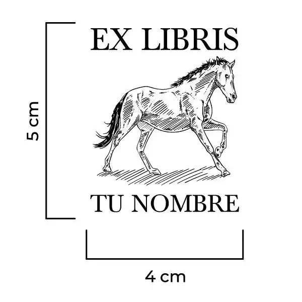 Sello Exlibris Caballo - Sello Exlibris Caballo. Sello de caucho exlibris con goma fabricada en resina para impresiones nítidas y de larga duración, montado en montura de hierro zincado, ventana de impresión de metacrilato y mango de madera lacado negro.