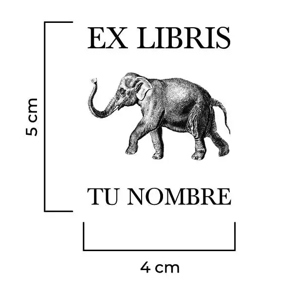 Sello Exlibris Elefante. Sello de caucho exlibris con goma fabricada en resina para impresiones nítidas y de larga duración, montado en montura de hierro zincado, ventana de impresión de metacrilato y mango de madera lacado negro.