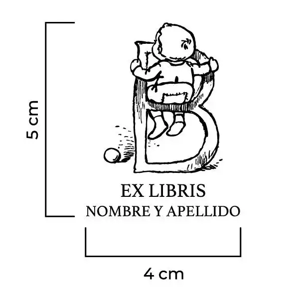 Sello Exlibris Infantil Letra B. Sello de caucho exlibris con goma fabricada en resina para impresiones nítidas y de larga duración, montado en montura de hierro zincado, ventana de impresión de metacrilato y mango de madera lacado negro.