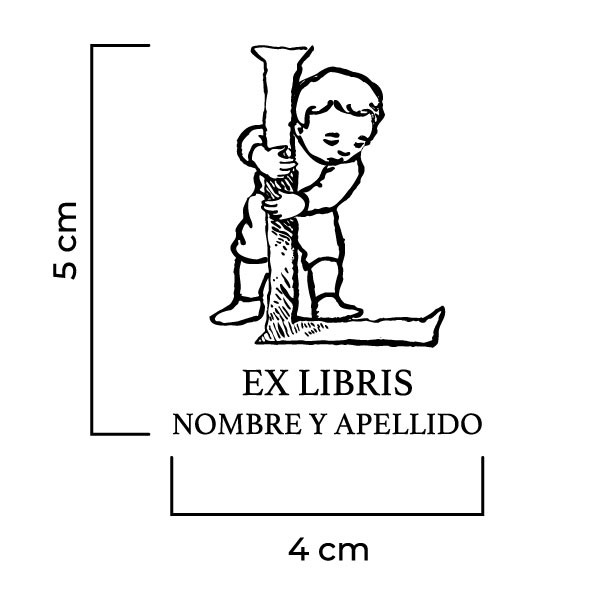 Sello Exlibris Infantil Letra L. Sello de caucho exlibris con goma fabricada en resina para impresiones nítidas y de larga duración, montado en montura de hierro zincado, ventana de impresión de metacrilato y mango de madera lacado negro.