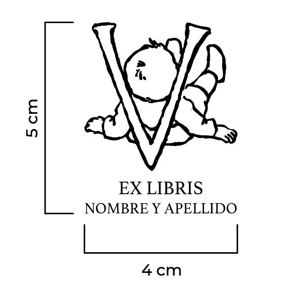 Sello Exlibris Infantil Letra V. Sello de caucho exlibris con goma fabricada en resina para impresiones nítidas y de larga duración, montado en montura de hierro zincado, ventana de impresión de metacrilato y mango de madera lacado negro.