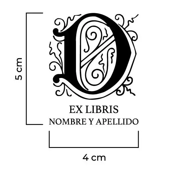 Sello Exlibris Letra D Genzsch. Sello de caucho exlibris con goma fabricada en resina para impresiones nítidas y de larga duración, montado en montura de hierro zincado, ventana de impresión de metacrilato y mango de madera lacado negro.