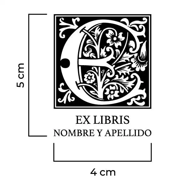 Sello Exlibris Letra E Rose. Sello de caucho exlibris con goma fabricada en resina para impresiones nítidas y de larga duración, montado en montura de hierro zincado, ventana de impresión de metacrilato y mango de madera lacado negro.