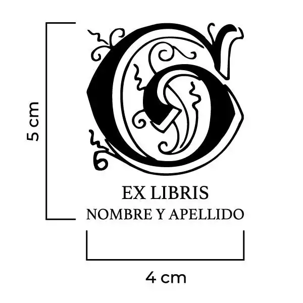 Sello Exlibris Letra G Genzsch. Sello de caucho exlibris con goma fabricada en resina para impresiones nítidas y de larga duración, montado en montura de hierro zincado, ventana de impresión de metacrilato y mango de madera lacado negro.