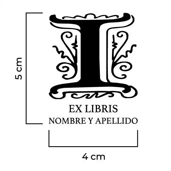 Sello Exlibris Letra I Genzsch. Sello de caucho exlibris con goma fabricada en resina para impresiones nítidas y de larga duración, montado en montura de hierro zincado, ventana de impresión de metacrilato y mango de madera lacado negro.
