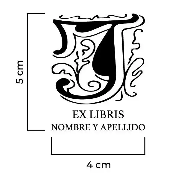 Sello Exlibris Letra J Genzsch. Sello de caucho exlibris con goma fabricada en resina para impresiones nítidas y de larga duración, montado en montura de hierro zincado, ventana de impresión de metacrilato y mango de madera lacado negro.
