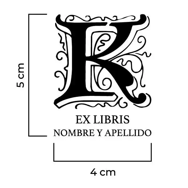 Sello Exlibris Letra K Genzsch. Sello de caucho exlibris con goma fabricada en resina para impresiones nítidas y de larga duración, montado en montura de hierro zincado, ventana de impresión de metacrilato y mango de madera lacado negro.