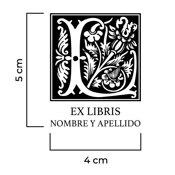 Sello Exlibris Letra L Rose. Sello de caucho exlibris con goma fabricada en resina para impresiones nítidas y de larga duración, montado en montura de hierro zincado, ventana de impresión de metacrilato y mango de madera lacado negro.