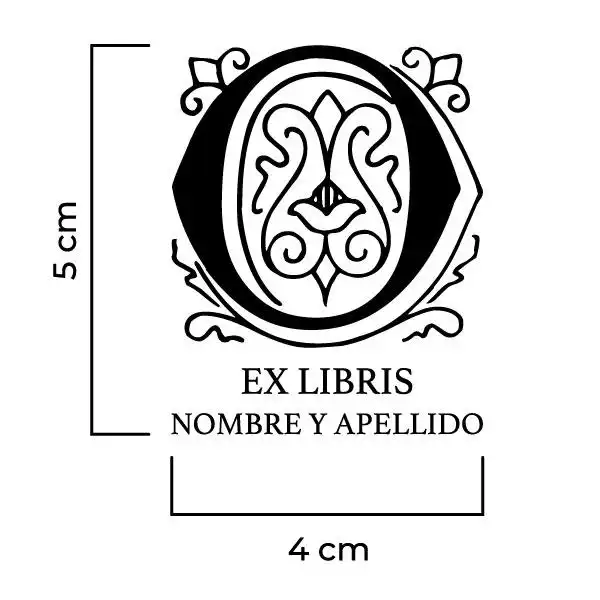 Sello Exlibris Letra O Genzsch. Sello de caucho exlibris con goma fabricada en resina para impresiones nítidas y de larga duración, montado en montura de hierro zincado, ventana de impresión de metacrilato y mango de madera lacado negro.