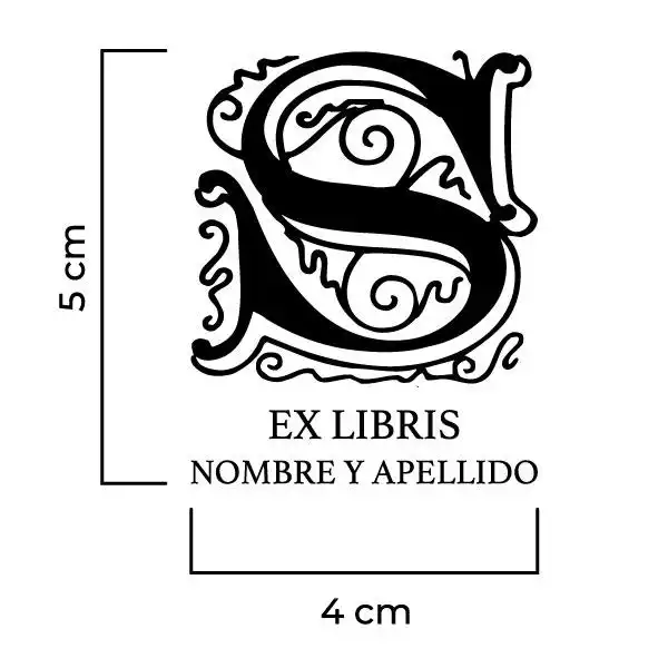Sello Exlibris Letra S Genzsch. Sello de caucho exlibris con goma fabricada en resina para impresiones nítidas y de larga duración, montado en montura de hierro zincado, ventana de impresión de metacrilato y mango de madera lacado negro.