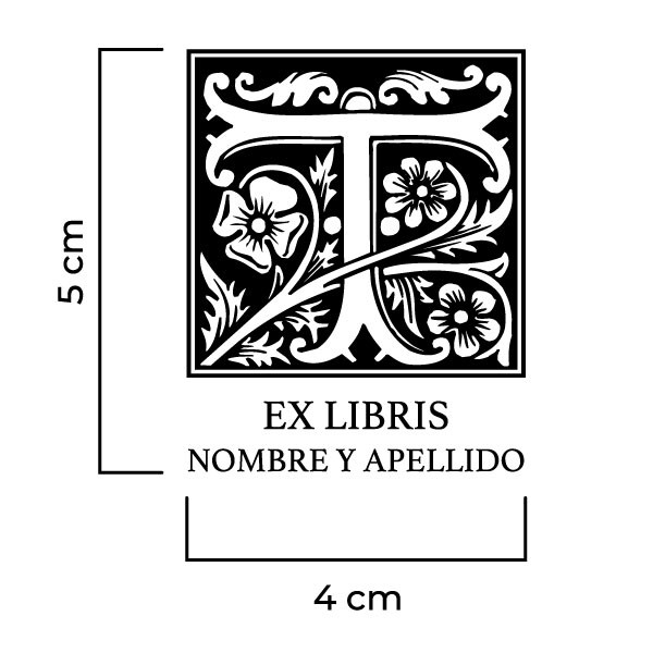 Sello Exlibris Letra T Rose. Sello de caucho exlibris con goma fabricada en resina para impresiones nítidas y de larga duración, montado en montura de hierro zincado, ventana de impresión de metacrilato y mango de madera lacado negro.