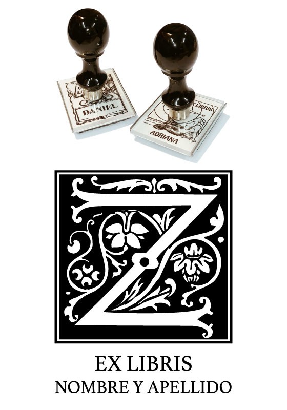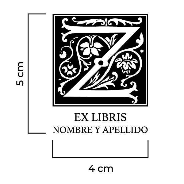 Sello Exlibris Letra Z Rose. Sello de caucho exlibris con goma fabricada en resina para impresiones nítidas y de larga duración, montado en montura de hierro zincado, ventana de impresión de metacrilato y mango de madera lacado negro.