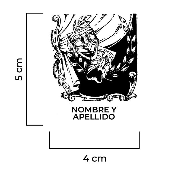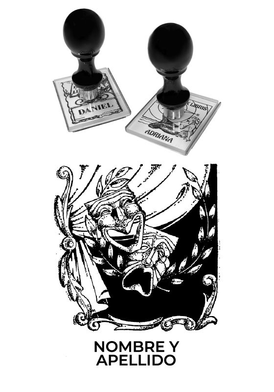 Sello Exlibris Teatro. Sello de caucho exlibris con goma fabricada en resina para impresiones nítidas y de larga duración, montado en montura de hierro zincado, ventana de impresión de metacrilato y mango de madera lacado negro.