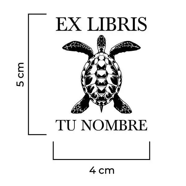 Sello Exlibris Tortuga. Sello de caucho exlibris con goma fabricada en resina para impresiones nítidas y de larga duración, montado en montura de hierro zincado, ventana de impresión de metacrilato y mango de madera lacado negro.