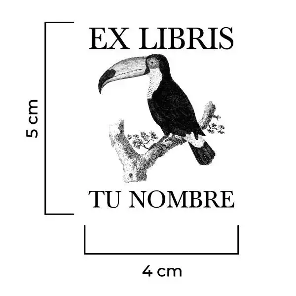 Sello Exlibris Tucán. Sello de caucho exlibris con goma fabricada en resina para impresiones nítidas y de larga duración, montado en montura de hierro zincado, ventana de impresión de metacrilato y mango de madera lacado negro.
