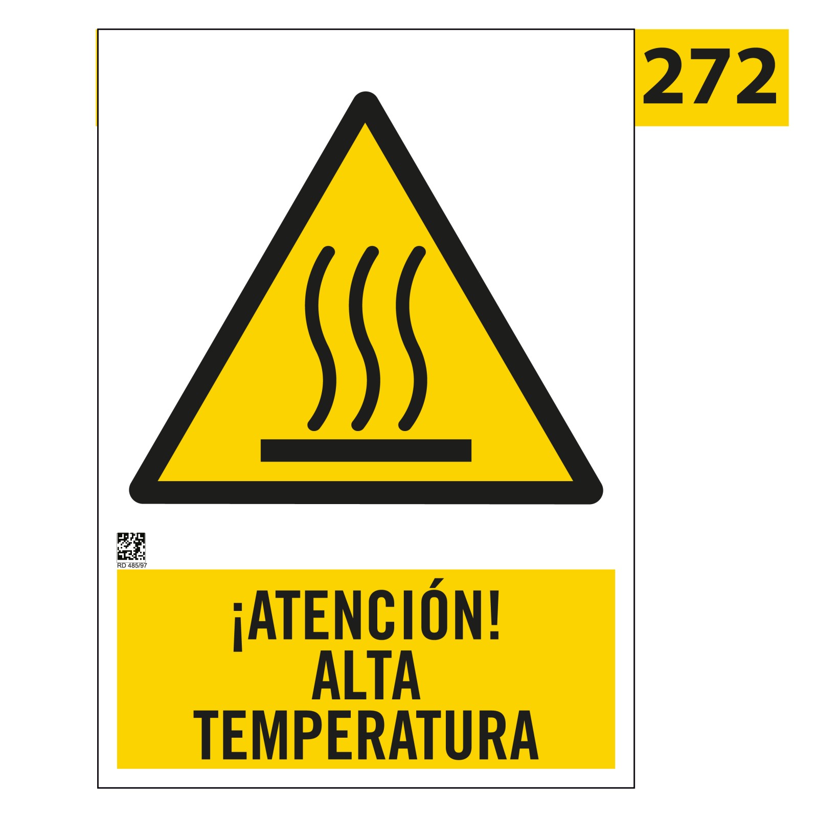 Señal de advertencia de peligro con pictograma y texto de Atención Alta Temperatura.