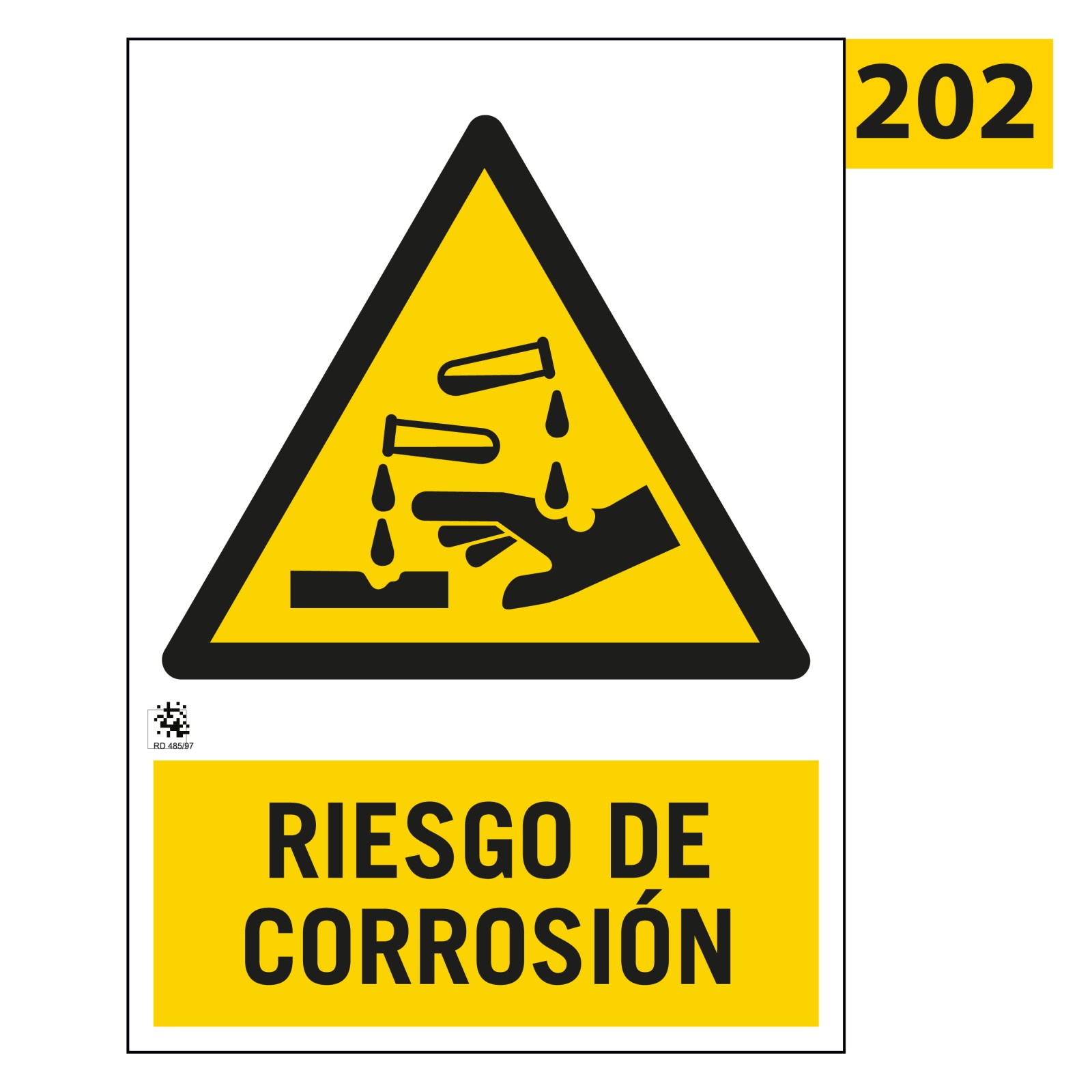 Señal de advertencia de peligro con pictograma y texto de Riesgo de Corrosión.