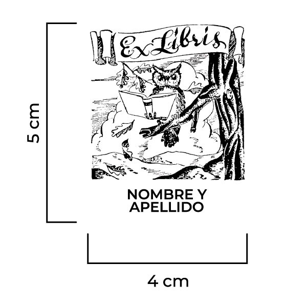 Sello Exlibris Búho. Sello de caucho exlibris con goma fabricada en resina para impresiones nítidas y de larga duración, montado en montura de hierro zincado, ventana de impresión de metacrilato y mango de madera lacado negro.