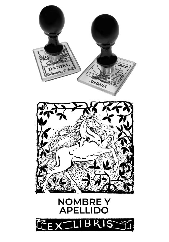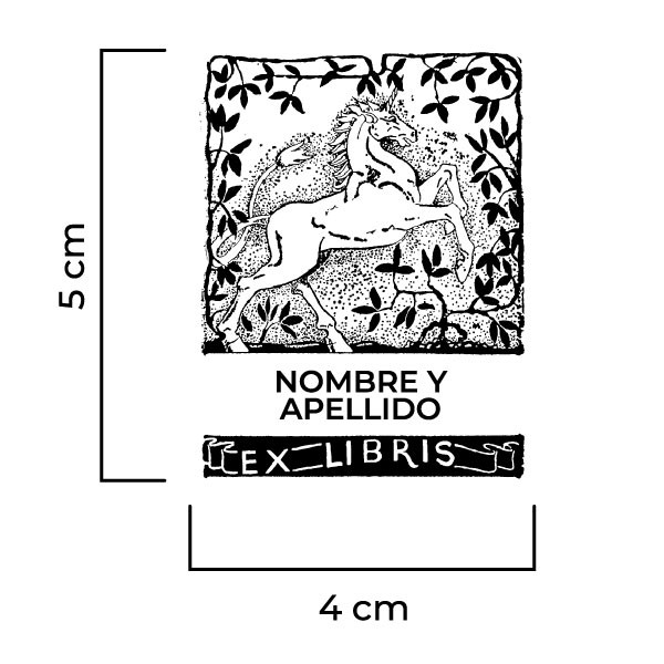 Sello Exlibris Unicornio. Sello de caucho exlibris con goma fabricada en resina para impresiones nítidas y de larga duración, montado en montura de hierro zincado, ventana de impresión de metacrilato y mango de madera lacado negro.